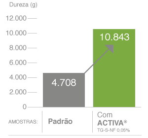O resultado da análise TPA (textura) evidencia que a amostra com ACTIVA® apresentou mais firmeza do que a amostra padrão.