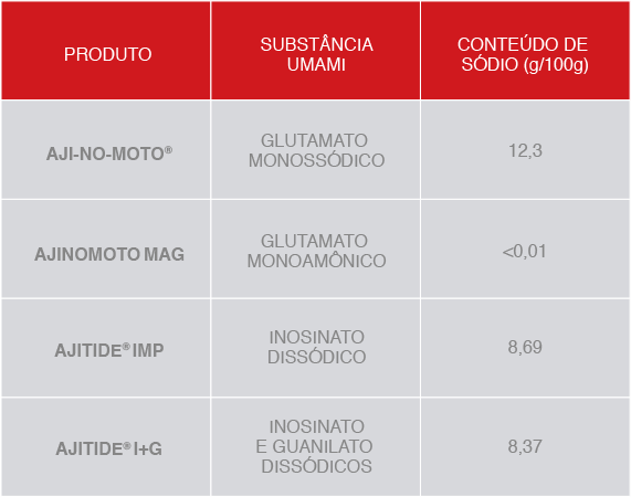 Confira o conteúdo de sódio por substância UMAMI (g/100g) e os benefícios